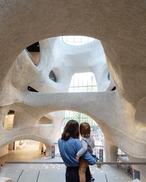 As a New Yorker, I’m obviously reminded of the American Museum of Natural History’s relatively recently opened addition, designed by architect Jeanne Gang and her firm Studio Gang. I am a fan of the cavernous, pebble colored-design, which looks as if it had sprouted from a cliffside on the Greek island Milos and less like it sits a block away from a Shake Shack. I am also reminded of David Adjaye’s Yoruba-inspired design of the National Museum of African American History and Culture and how he didn’t want the building to be another “stone box with things in it.”