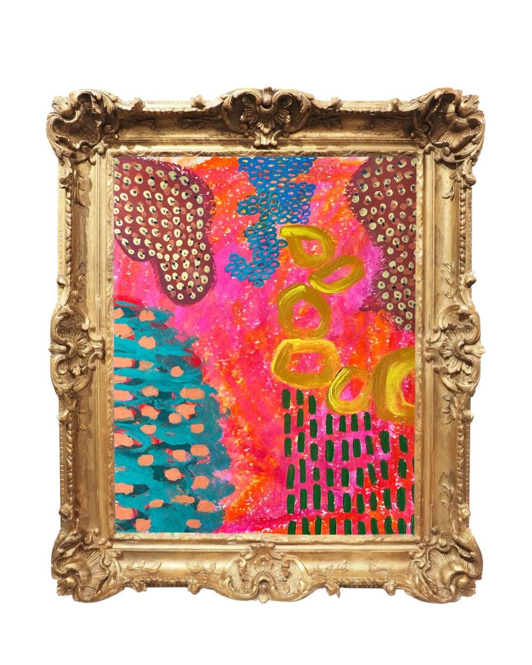 It started with me embellishing my daughter’s work—going, “What if we put that there?”—to eventually feeling confident enough to make my own. I started going to Goodwill and getting old paintings with really nice frames and canvases I could paint over. I started painting things that I wanted to see in my home and sharing them online. And it just became a fun thing to do.