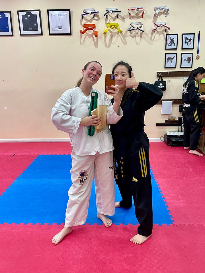 It’s so fun. When I started, I had two instructors who were really cool taekwondo ladies, and I think that’s why I started to love it. They were super encouraging while also being really tough.