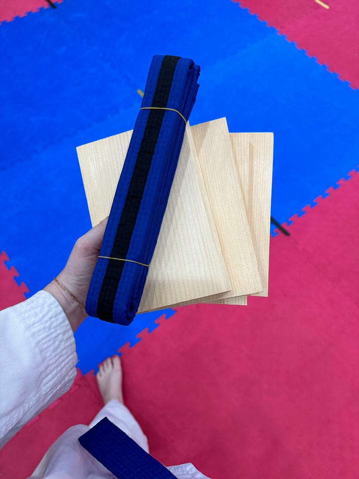 Yes! To get the next belt, you have to chop a board. It gets thicker as you advance, but it also gets easier because you're no longer afraid of cutting it in half. But the techniques do get harder. My last one, I had to run in, literally jump in the air, and kick from the side.
