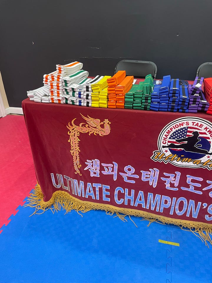 When you get closer to a black belt, the tests start to get very crazy, and you have to memorize all the routines that you did prior.